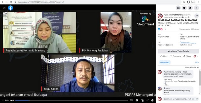 23 Ogos 2021 | Aktiviti Terkini22 Ogos 2021 : PIK Manong telah membuat satu program Forum secara atas talian bagi membincangkan isu semasa terkini dikalangan komuniti setempat. PIK Manong telah menjemput Tuan Haji Abdul Hakim Bin Mohamad merupakan Kaunselor berdaftar (KKPWM) dan berkhidmat sebagai guru kaunselor di SMK Sultan Tajul Ariffin Manong.Tajuk semasa yang dibincangkan ialah berkenaan emosi ibu bapa bagi menghadapi PdPR.