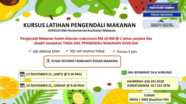 20 November 2021 | Aktiviti Terkini19 November 2021 : Kursus Pengendali Makanan secara talian telah dijalankan di PEDi Manong untuk usahawan yang berminat. Kursus tersebut merupakan permintaan usahawan di Manong. Kami telah menjalan dua sesi kursus iaitu pada 13 November 2021 dan 19 November 2021. Seramai 13 peserta telah terlibat dalam kedua sesi tersebut. Kursus ini merupakan kursus yang wajib diambil khususnya buat usahawan yang mengendalikan makanan juga pekerja-pekerja yng terlibat dengan jualan makanan. Sijil kursus perlu dimiliki oleh peserta setelah selesai jalani kursus selama 3. Pihak PEDi Manong telah membuat usahasama dengan pihak Sekolah Latihan Pengendali Makanan iaitu NZ Bunga Venture dan disahkan oleh Kementerian Kesihatan Malaysia. Semoga dengan kursus ini dapat membantu para usahawan setempat di Manong terutamanya mendapatkan sijil yang sah.