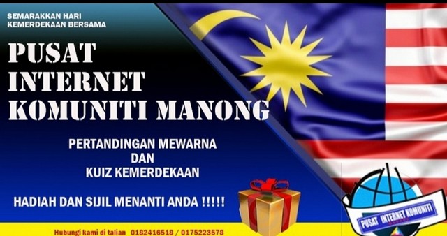 31 Ogos 2021 | Aktiviti Terkini30 Ogos 2021 : PIK Manong telah menganjurkan 2 pertandingan sempena Kemerdekaan ke 64 bersama komuniti secara atas talian. Program bermula 16 Ogos 2021 sehingga 27 Ogos. Pertandingan yang pertama pertandingan mewarna kanak-kanak bagi umur 9 tahun ke bawah dengan membuat dua kategori iaitu tahap 1 sekolah rendah dan kategori Tabika/Pra sekolah. Hasil lukisan mewarna dihantar melalui platform google form yang pihak PIK sediakan. Sambutan sangat menggalakkan. Seramai 30 penyertaan kanak-kanak di Komuniti Manong. Pertandingan kedua ialah Kuiz Merdeka Terbuka secara atas talian. Juga melibatkan penyertaan melalui google form. Seramai 50 orang peserta telah sertai kuiz tersebut. Tahniah kepada semua pemenang yang terpilih, dan terima kasih diucapkan kepada komuniti di Manong yang sentiasa menyokong sebarang program yang PIK Manong jalankan.