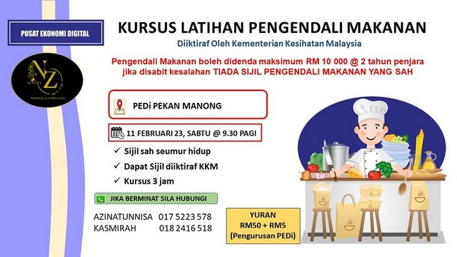 12 Febuari 2023 | Aktiviti Terkini11 Febuari 2023 : Kursus Latihan Pengendali Makanan sesi Febuari dijalankan di PEDi Manong secara atas talian. Seramai 7 orang peserta yang terdiri daripada usahawan makanan di Manong. Tahniah kepada peserta yang selesai jalani kursus selama 3 jam secara atas talian. Kursus dijalankan oleh Sekolah Latihan Pengendali Makanan yg diiktiraf Kementerian Kesihatan Malaysia iaitu NZ Bunga Venture.