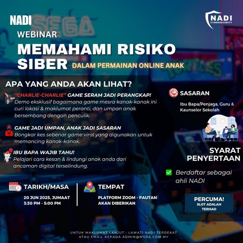 20.6.2025 : Webinar Cybersecurity bertajuk Memahami Risiko Siber Dalam Permainan Online Anak pada 20 Jun 2025 | 3.30 - 5.00 petang di platform Zoom Meeting. Webinar ini memberi pendedahan kepada ibu bapa, guru dan kaunselor tentang ancaman tersembunyi dalam permainan online mesra kanak-kanak. Ia membongkar taktik permainan digunakan untuk mencuri maklumat dan memperdaya anak-anak, serta langkah perlindungan daripada ancaman digital.
