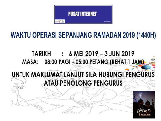 6 May 2019 | Aktiviti TerkiniBerikut adalah Notis Waktu Operasi Pusat Internet Pekan Manong pada bulan Ramadhan bermula 6 Mei - 3 Jun 2019