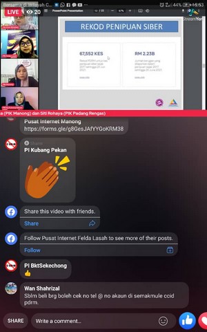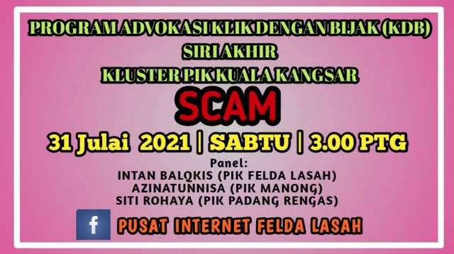 1 Ogos 2021 | Aktiviti Terkini31 JULAI 2021 : PIK Manong bersama PIK Kluster Kuala Kangsar telah buat satu program Advokasi Klik Dengan Bijak secara onlive live di facebook page PIK. Tajuk kali ni merupakan tajuk SCAM. Telah disampaikan oleh Cik Intan Balqis dari PIK felda Lasah, Puan Azinatunnisa dari PIK Manong dan Cik Rohaya dari PIK Padang Rengas.