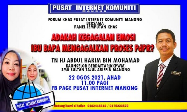 23 Ogos 2021 | Aktiviti Terkini22 Ogos 2021 : PIK Manong telah membuat satu program Forum secara atas talian bagi membincangkan isu semasa terkini dikalangan komuniti setempat. PIK Manong telah menjemput Tuan Haji Abdul Hakim Bin Mohamad merupakan Kaunselor berdaftar (KKPWM) dan berkhidmat sebagai guru kaunselor di SMK Sultan Tajul Ariffin Manong.Tajuk semasa yang dibincangkan ialah berkenaan emosi ibu bapa bagi menghadapi PdPR.