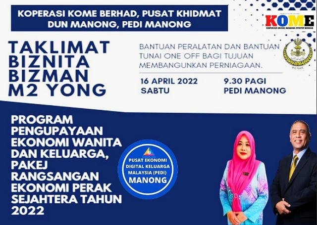 17 April 2022 | Aktiviti Terkini16 April 2022 : PEDi Manong memberikan taklimat berkenaan tawaran permohonan bantuan perniagaan dari seketariat Wanita Perak untuk usahawan di DUN Manong. Antara bantuan yang diberikan ialah bantuan Biz Nita dan Biz Man bagi permohonan bantuan peralatan perniagaan. Bantuan M2Yong bagi bantuan kewangan modal perniagaan. PEDi Manong membantu lebih dari 30 usahawan DUN Manong dalam merebut peluang yang ditawarkan oleh kerajaan Negeri Perak di bawah seketeriat Wanita khusus untuk semua usahawan.