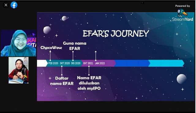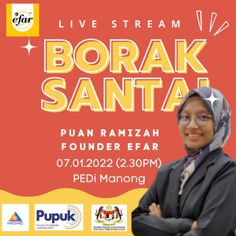 8 Januari 2022 | Aktiviti Terkiniusahawan yang berjaya iaitu Founder Efar yang bernama Ramizah Raza. Dalam borak santai ini, RD telah menemu bual usahawan tentang permulaan beliau menjadi usahawan. Turut membincangkan pengalaman jatuh bangun beliau sehingga menjadi founder yang berjaya serta cabaran-cabaran beliau untuk mengekalkan produk beliau dipasaran. Efar merupakan pengeluar produk berasaskan coklat dan biskut.
