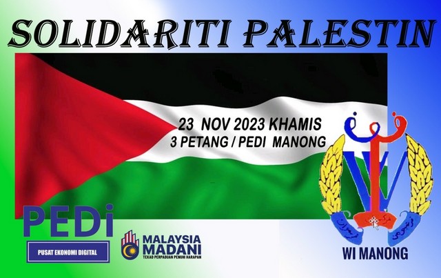 24 November 2023 | Aktiviti Terkini23.11.2023 : PEDi Manong bersama NGO komuniti setempat iaitu WI Manong dalam program Solidariti Palestine. Penghasilan bendera besar, cetusan ucapan serta bacaan yassin mohon dipermudahkan semua urusan saudara seislam kita di sana. Kehadiran seramai 40 orang berjaya menyiapkan bendera besar Palestine.