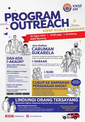 21 Ogos 2024 | Aktiviti Terkini20.08.2024: NADI Manong telah bekerjasama KWSP Kuala Kangsar dalam program Outreach KWSP. Program ini bertujuan bagi pembukaan kaunter perkhidmatan KWSP di NADI Manong.